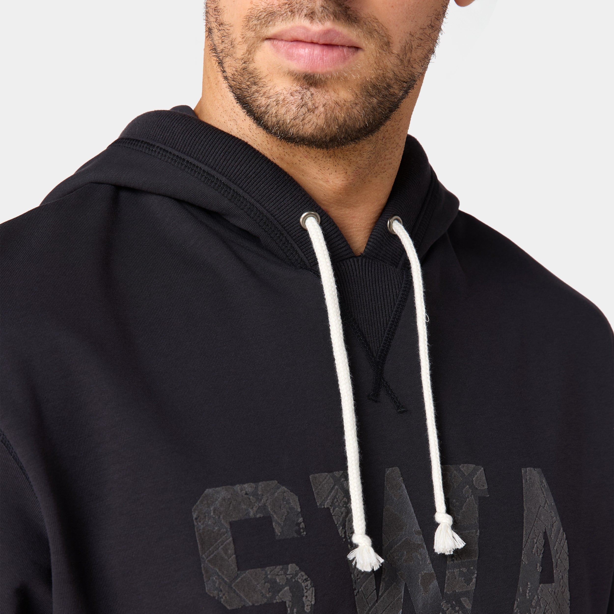 “Muscle to Kite Beach” SWA distressed flock print on the front chest Large kangaroo pocket with stitching details for added texture Ribbed hood detail with vintage-style drawcords Rib insert with stitching details at the neckline SQUATWOLF varsity letter S embroidery on the hood Signature internal jock tag on the left side of the kangaroo pocket Relaxed fit Model Wearing Medium: Height 6'1" / 186 cm // Chest: 38″ // Waist: 36″