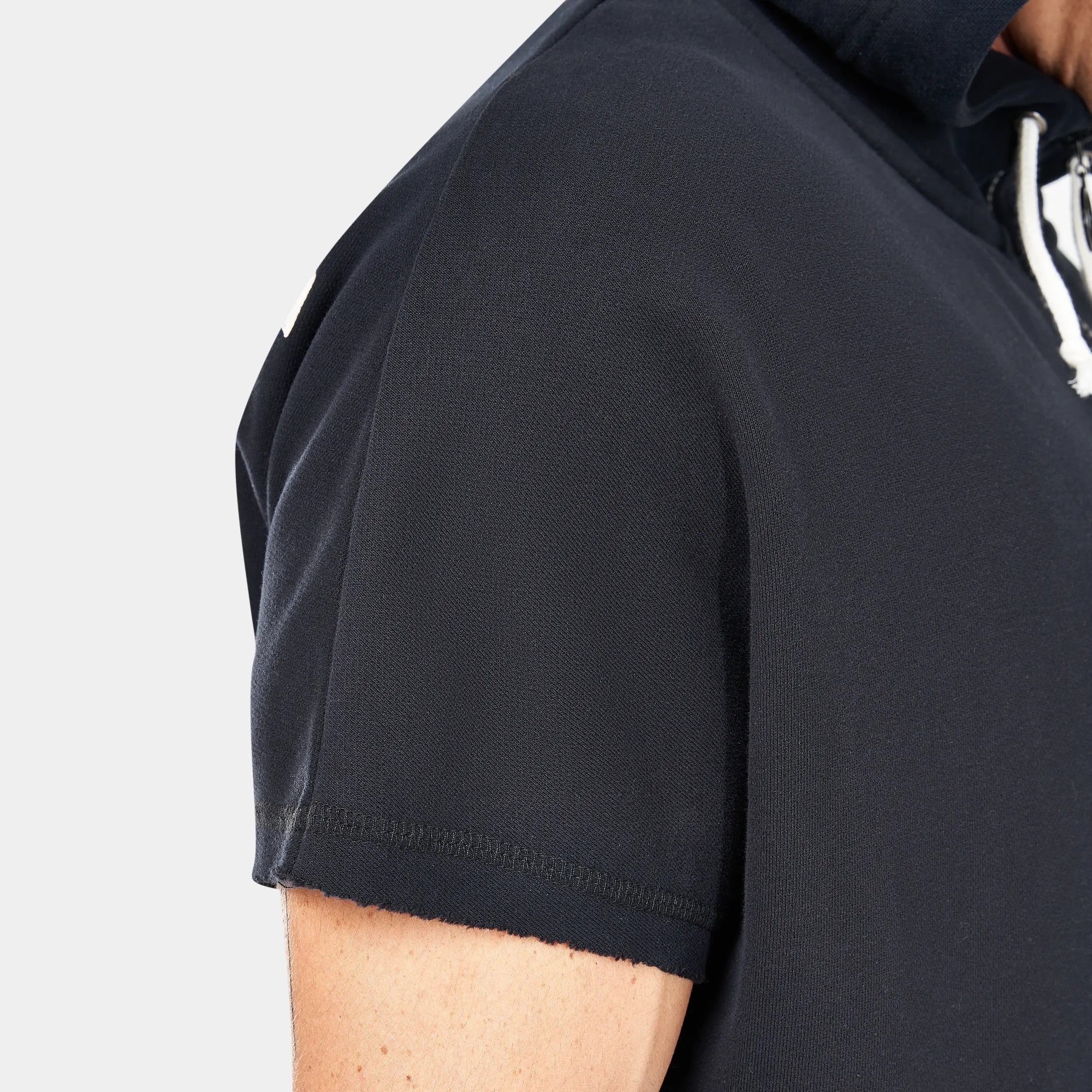 Dropped shoulder with a raw edge armhole finish for ease of movement