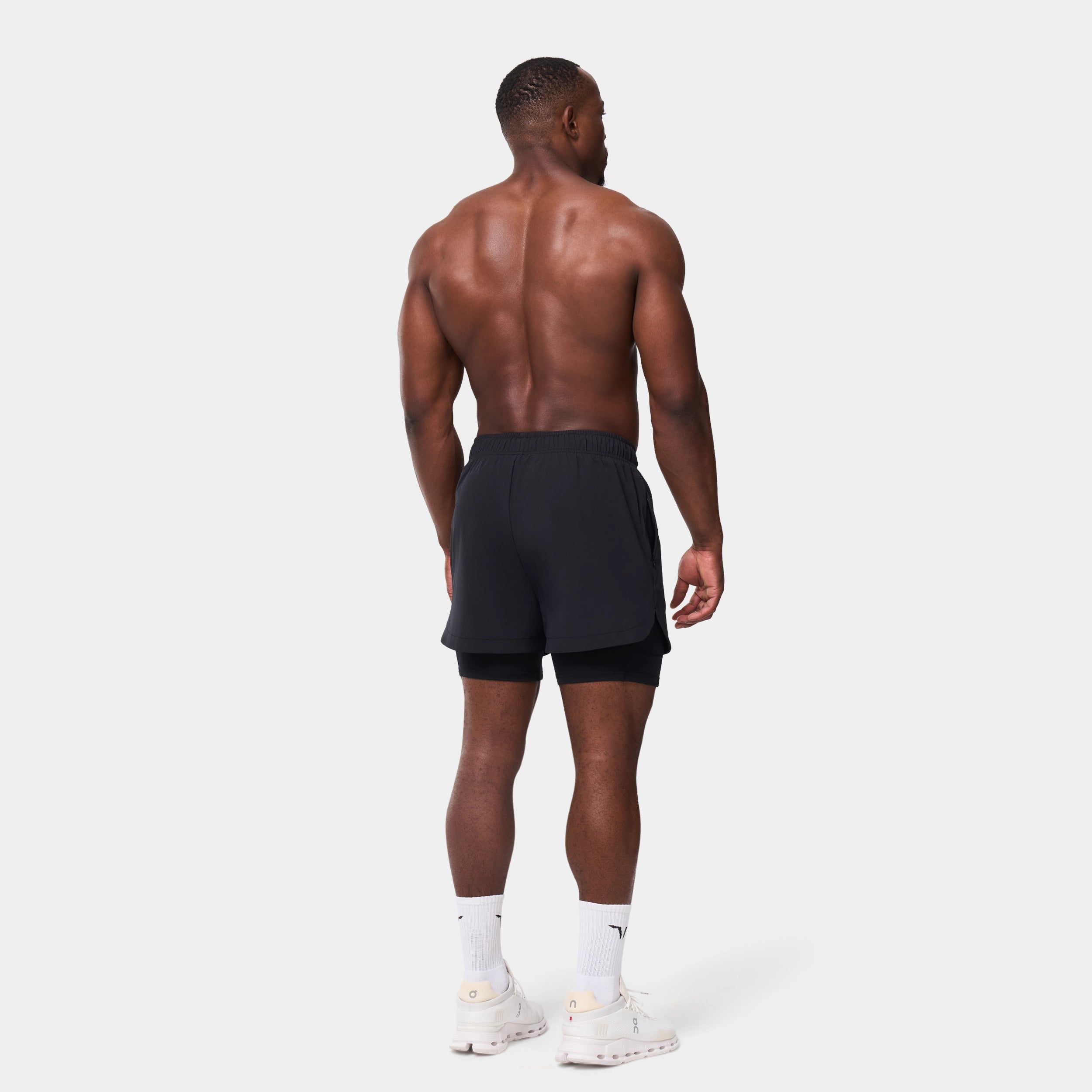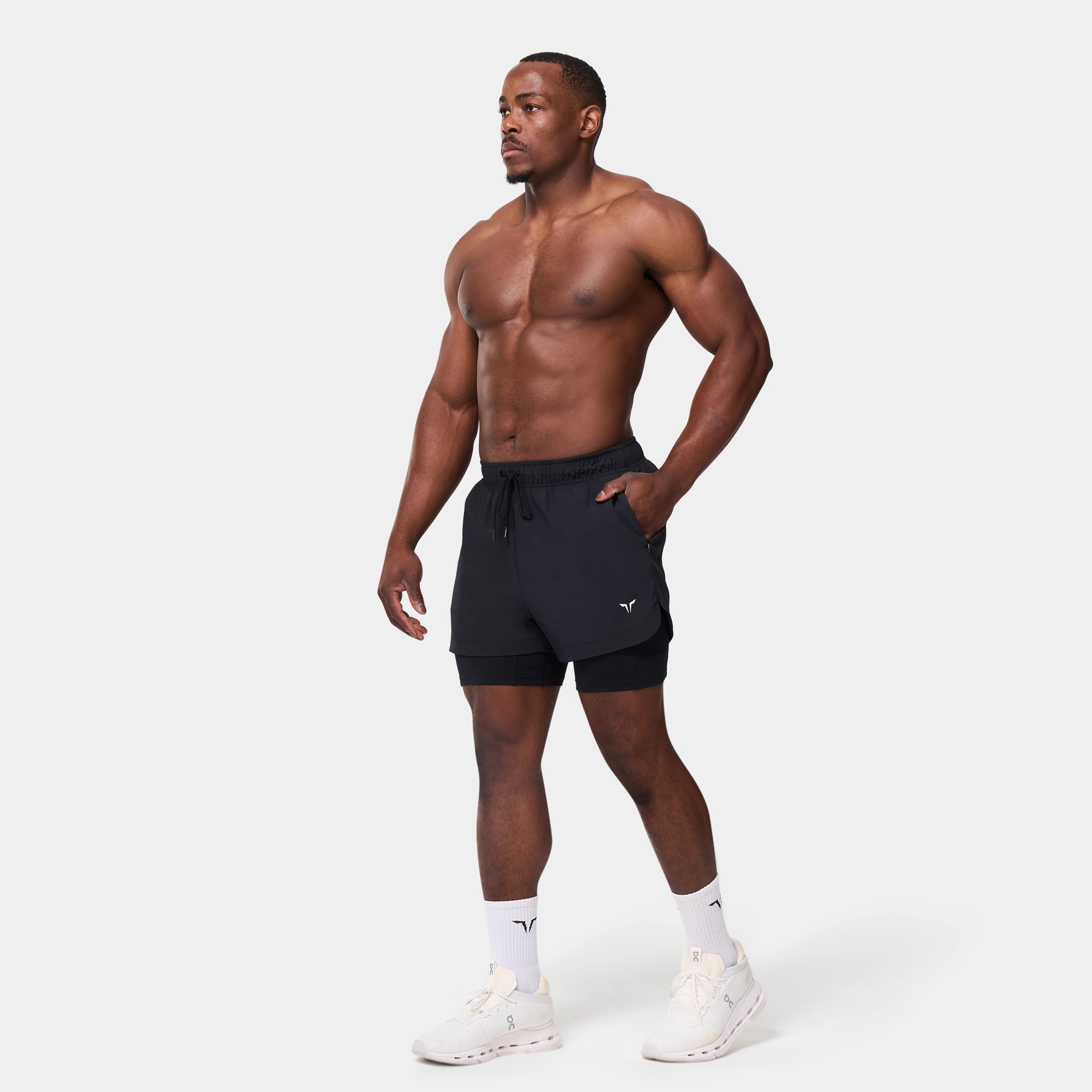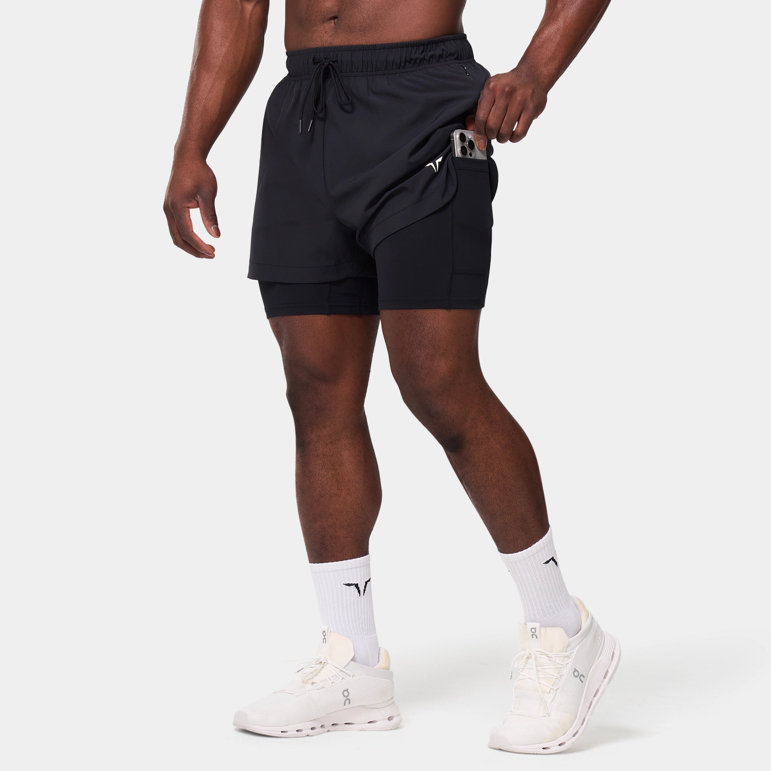 Elasticated waistband with a drawcord for an adjustable fit Side seam pockets with concealed zips for secure storage Inner shorts with a slip pocket on the thigh for added convenience Icon logo on the front left hem Regular fit Model Wearing Medium: Height 5'9" / 175 cm // Chest: 39" // Waist: 32" Inseam length for outer short: 3" Inseam length for inner short: 5"