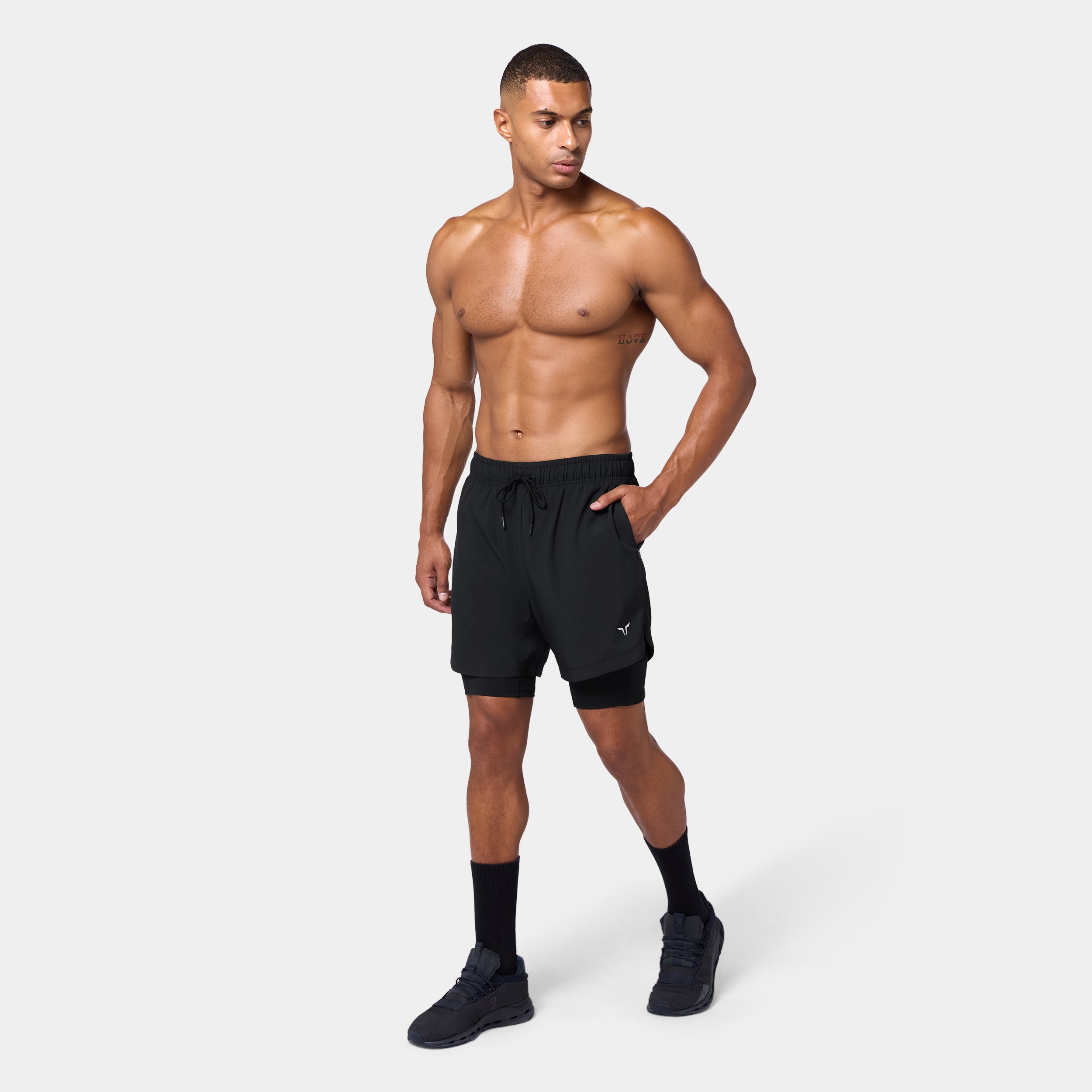 Elasticated waistband with a drawcord for an adjustable fit Side seam pockets with concealed zips for secure storage Inner shorts with a slip pocket on the thigh for added convenience Icon logo on the front left hem All-over print available on selected colourways Regular fit Model Wearing Medium: Height 6'2" / 187 cm // Chest: 44" // Waist: 32.5" Inseam length for outer short: 5" Inseam length for inner short: 7"