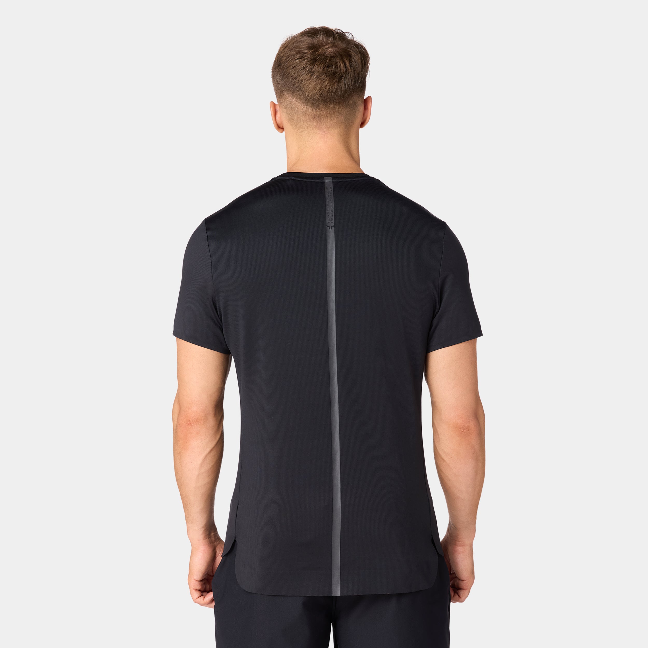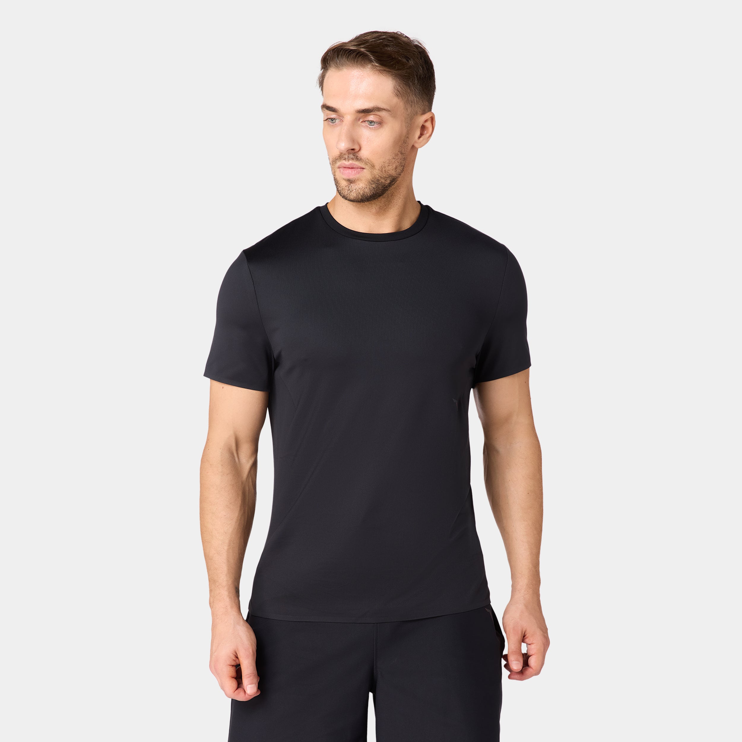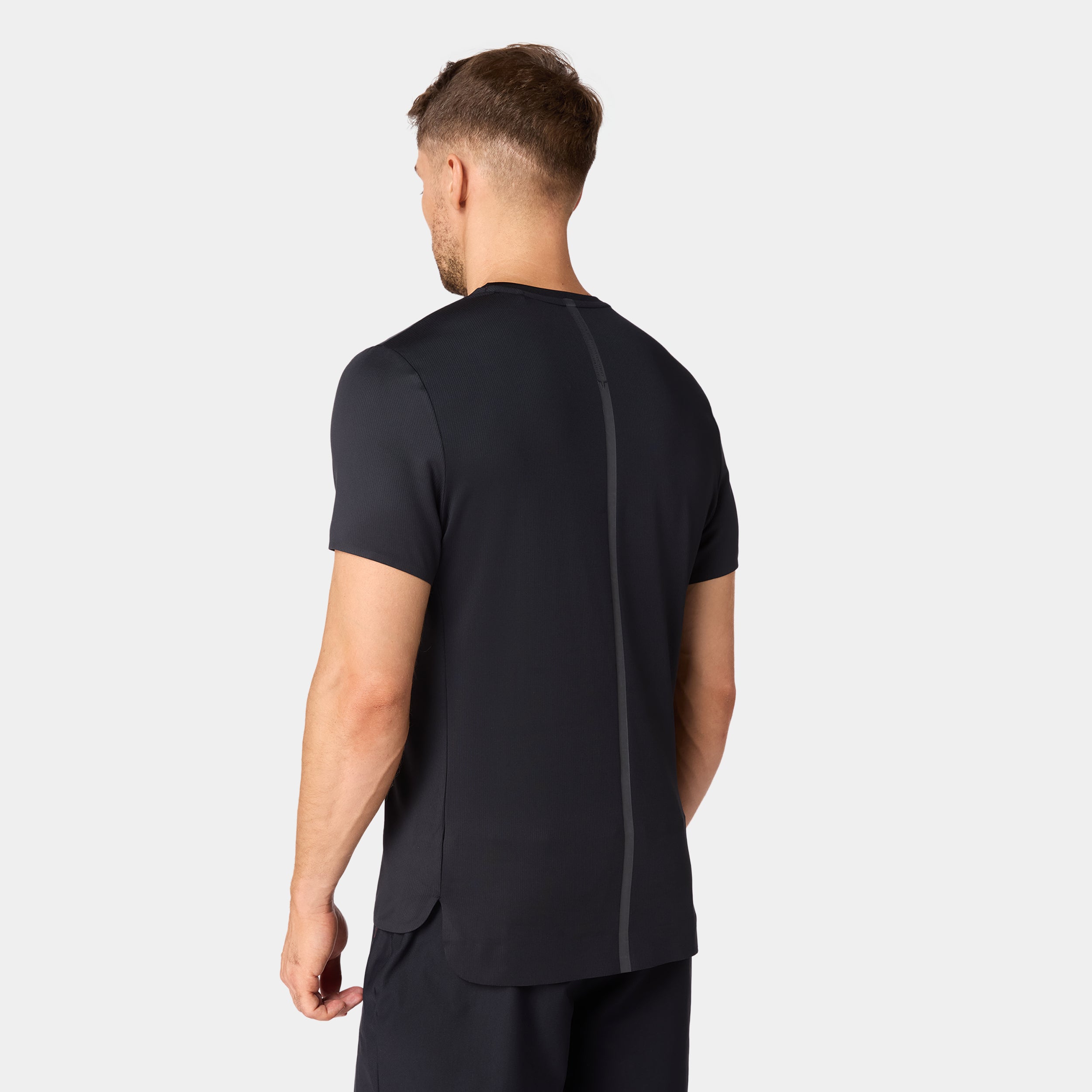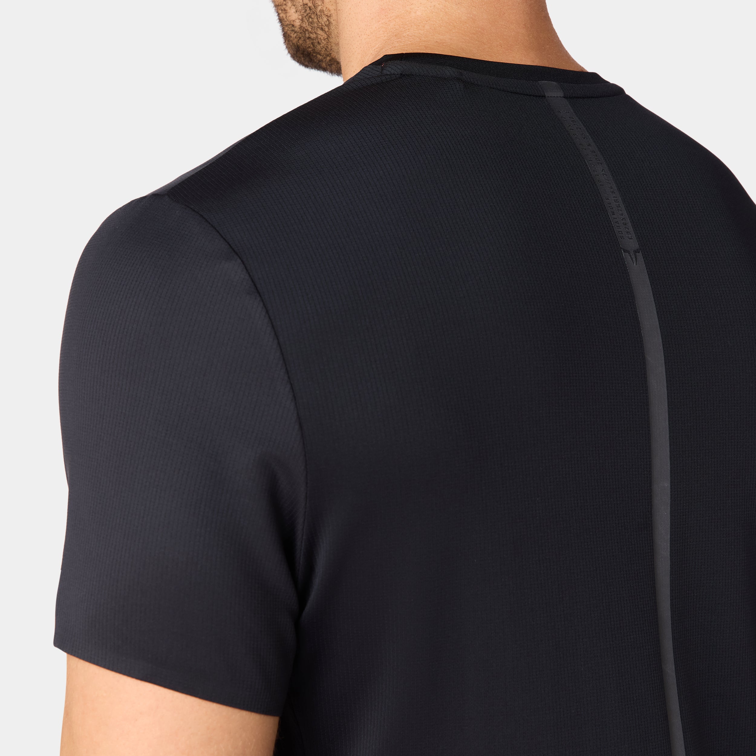 ACTDry® technology to keep you cool and dry Articulated chest panel for a structured fit Bonded short sleeves and hemline for a clean finish Bonded side vent for better movement Internal silicone gripper tape at the back hem to keep it in place Icon logo in reflective silicone heat transfer on the front left side Reflective rubber heat transfer graphic across the full back for visibility Athletic fit Model Wearing Medium: Height 6'1" / 186 cm // Chest: 38" // Waist: 36"