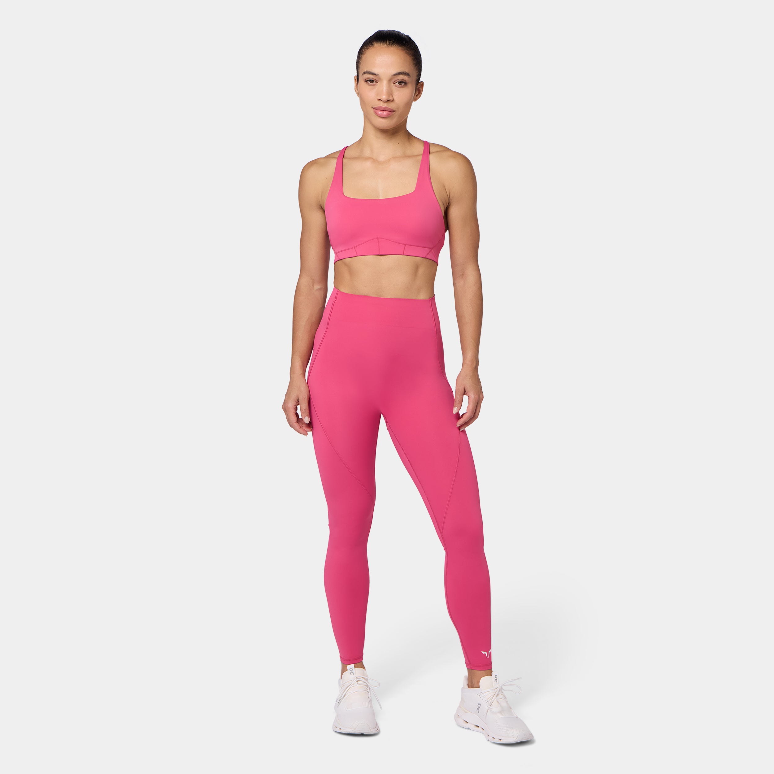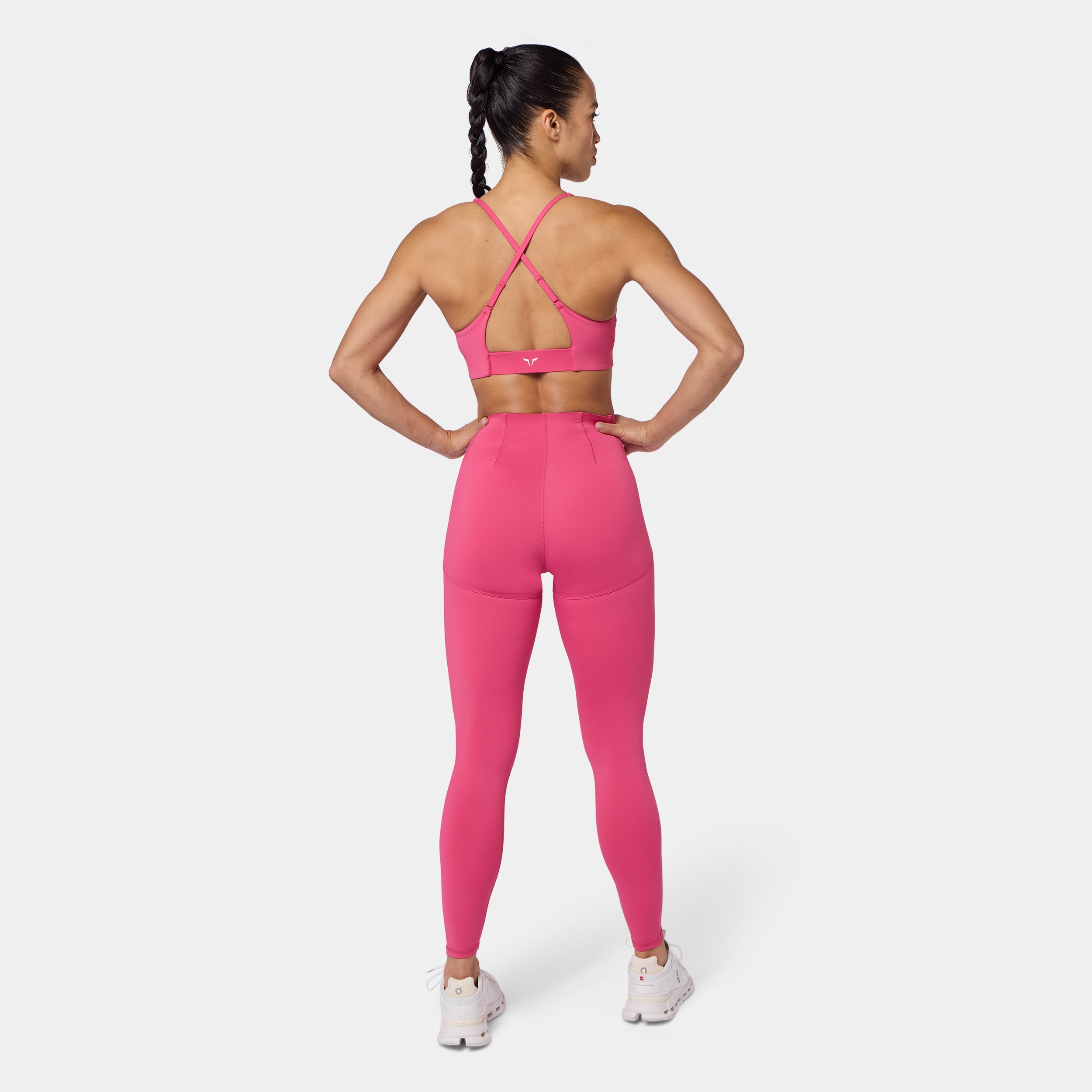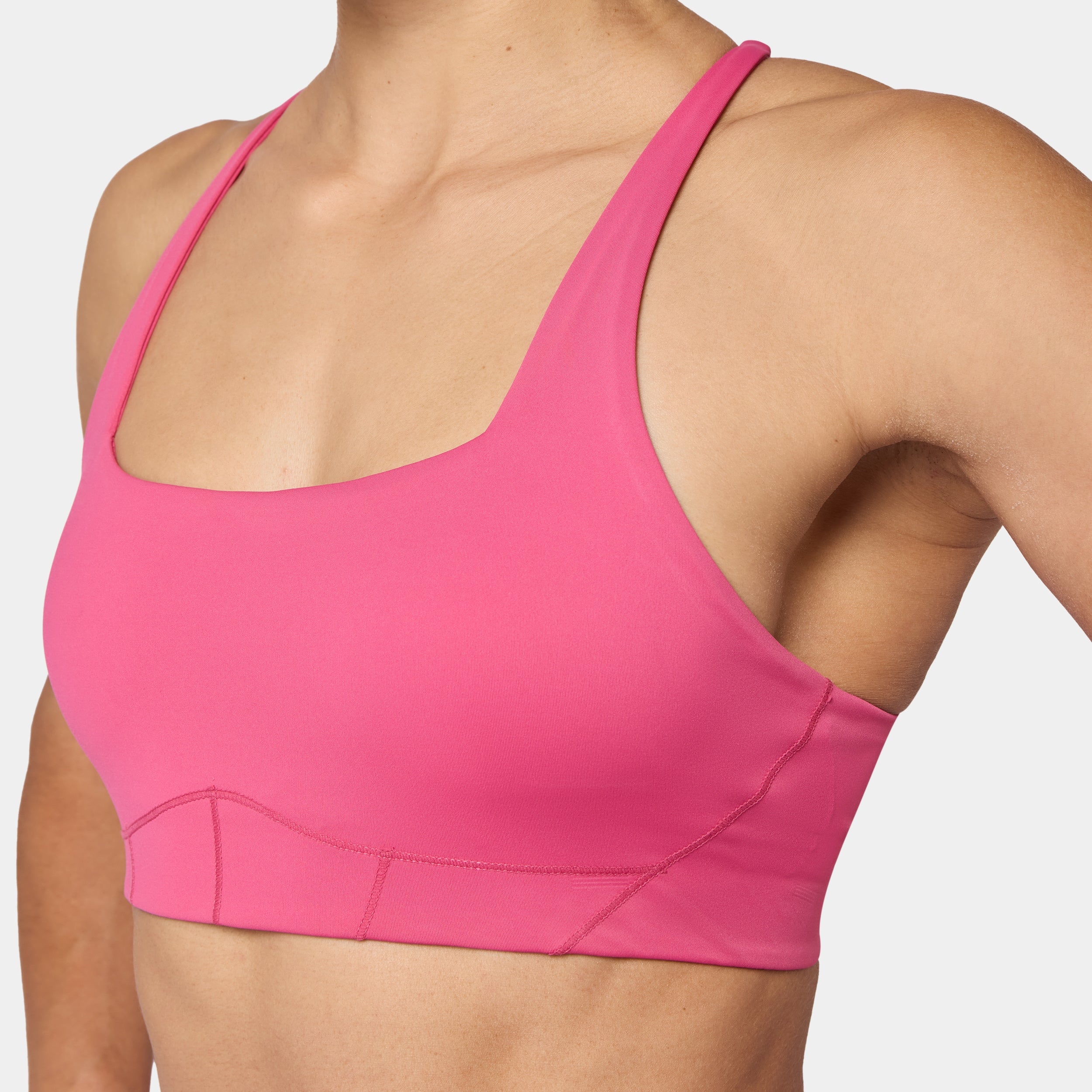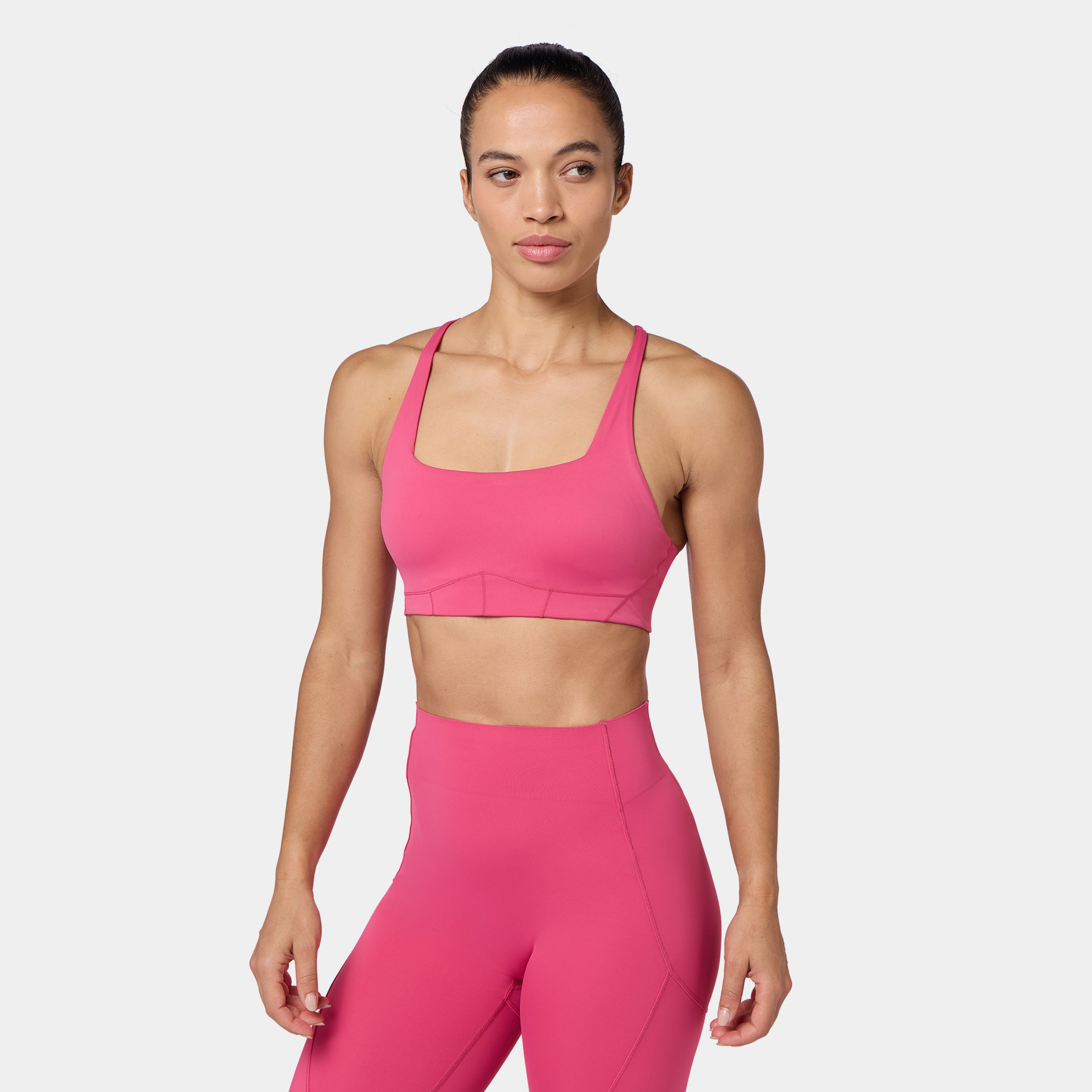 Square neckline for a bold, modern look Contour seam detailing for a sculpted fit Removable cups for customizable support Cross-back design for added style and flexibility Adjustable straps for a personalised fit Icon logo in silicone heat transfer on the back band Low coverage A/B cup Model Wearing Small: Height 5'8" / 174 cm // Bust: 33.5" // Waist: 26.5" // Hips: 38"