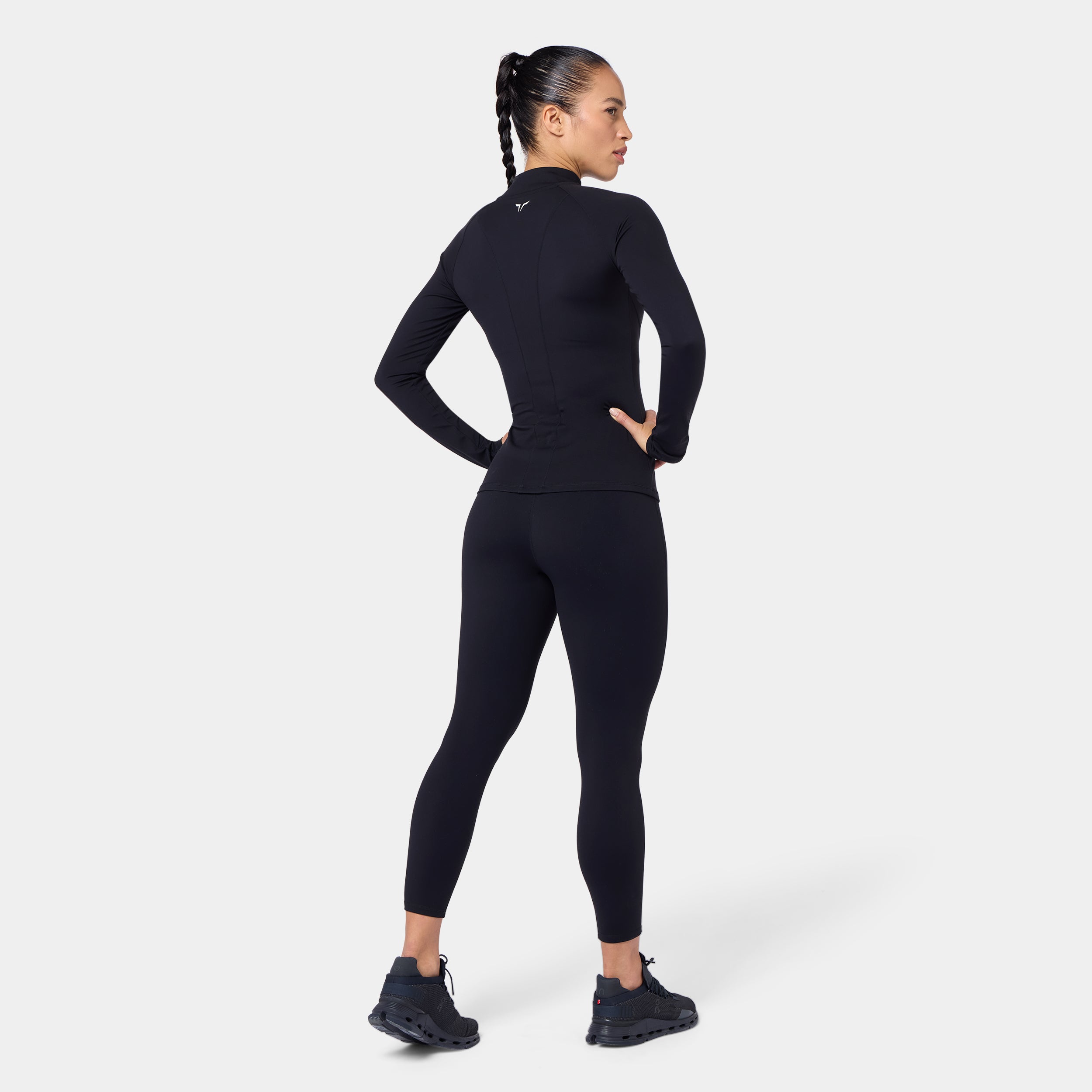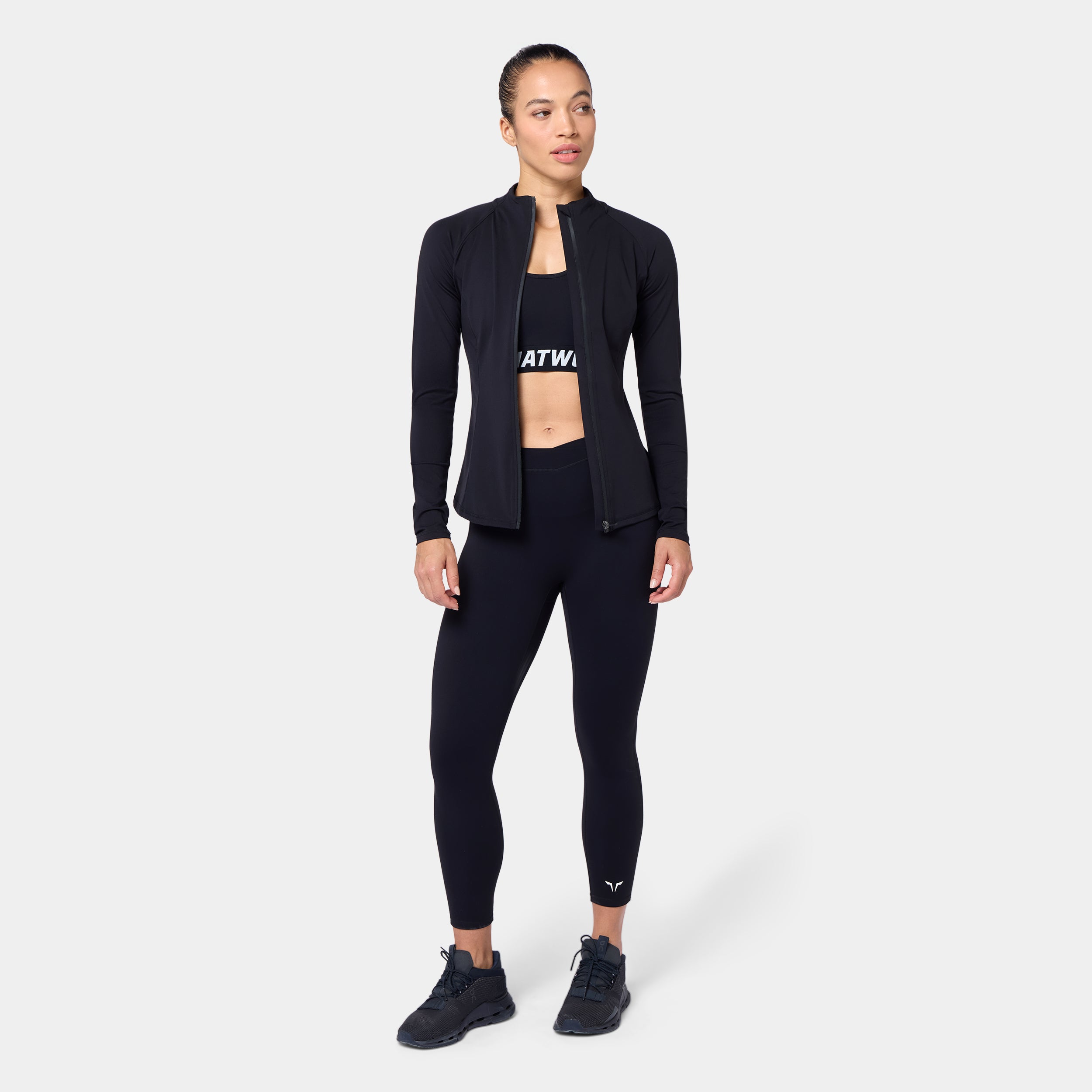 Grown-on (integrated) front neckline for a smooth, seamless look Raglan long sleeves for easy movement Full PU-coated zip front closure for a sleek finish Bonded internal zip guard for added comfort Contour seam detailing throughout for a sculpted fit Icon logo in silicone heat transfer on the back neck Athletic fit Model Wearing Small: Height 5'8" / 174 cm // Bust: 33.5" // Waist: 26.5" // Hips: 38"