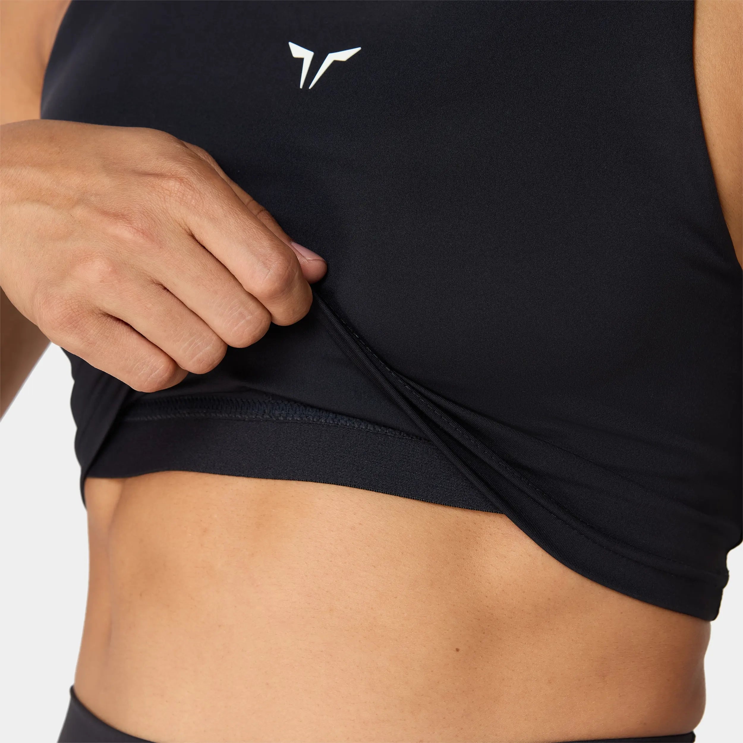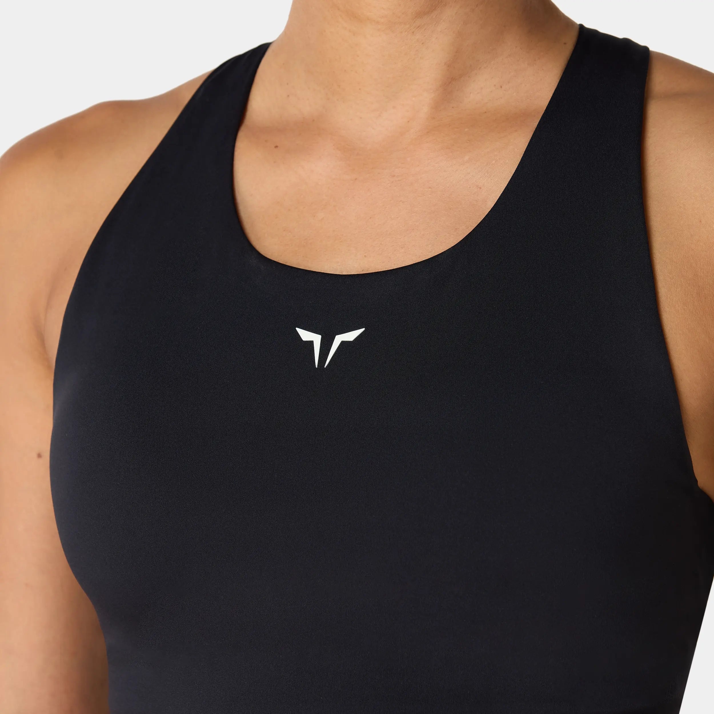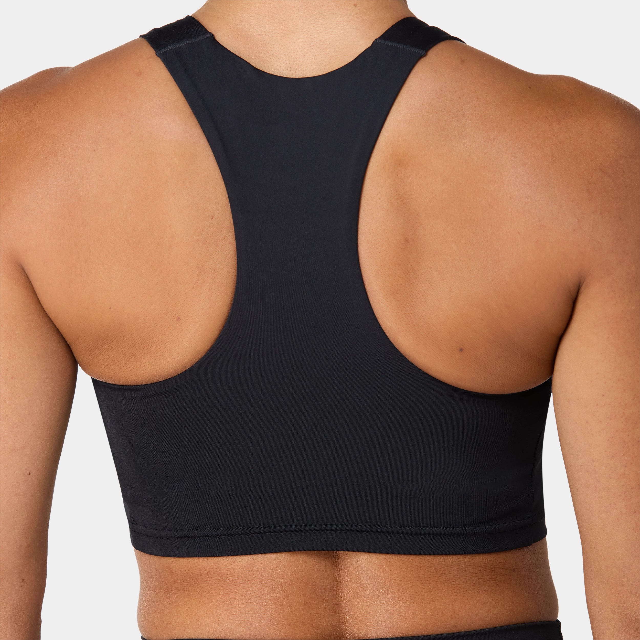 Scooped neckline Racerback design for ease of movement Built-in shelf bra with removable cups Icon logo on front chest High coverage Model Wearing Small: Height 5'7" / 176 cm // Bust: 34" // Waist: 31" // Hips: 40"