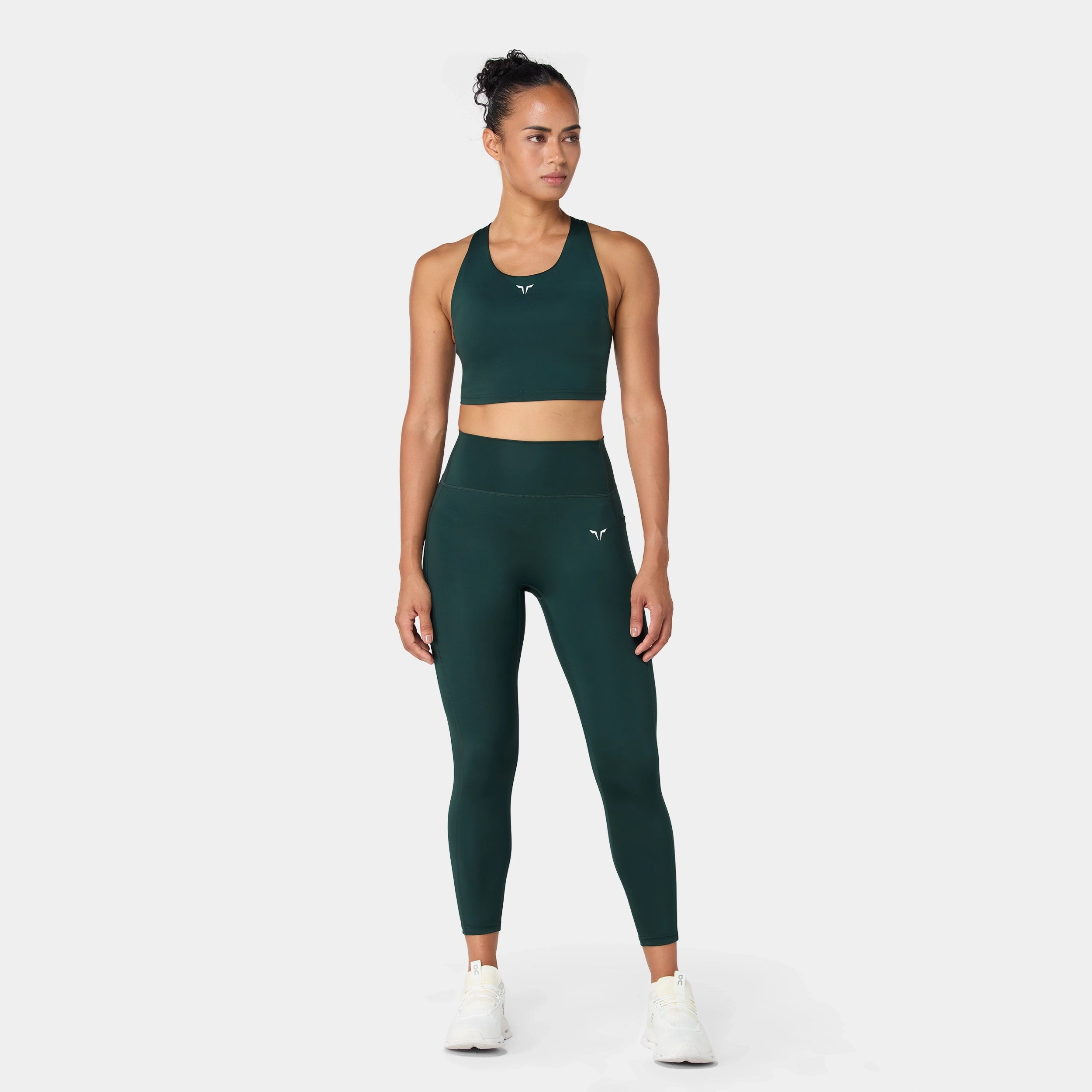 Scooped neckline Racerback design for ease of movement Built-in shelf bra with removable cups Icon logo on front chest High coverage Model Wearing Small: Height 5'7" / 176 cm // Bust: 34" // Waist: 31" // Hips: 40"
