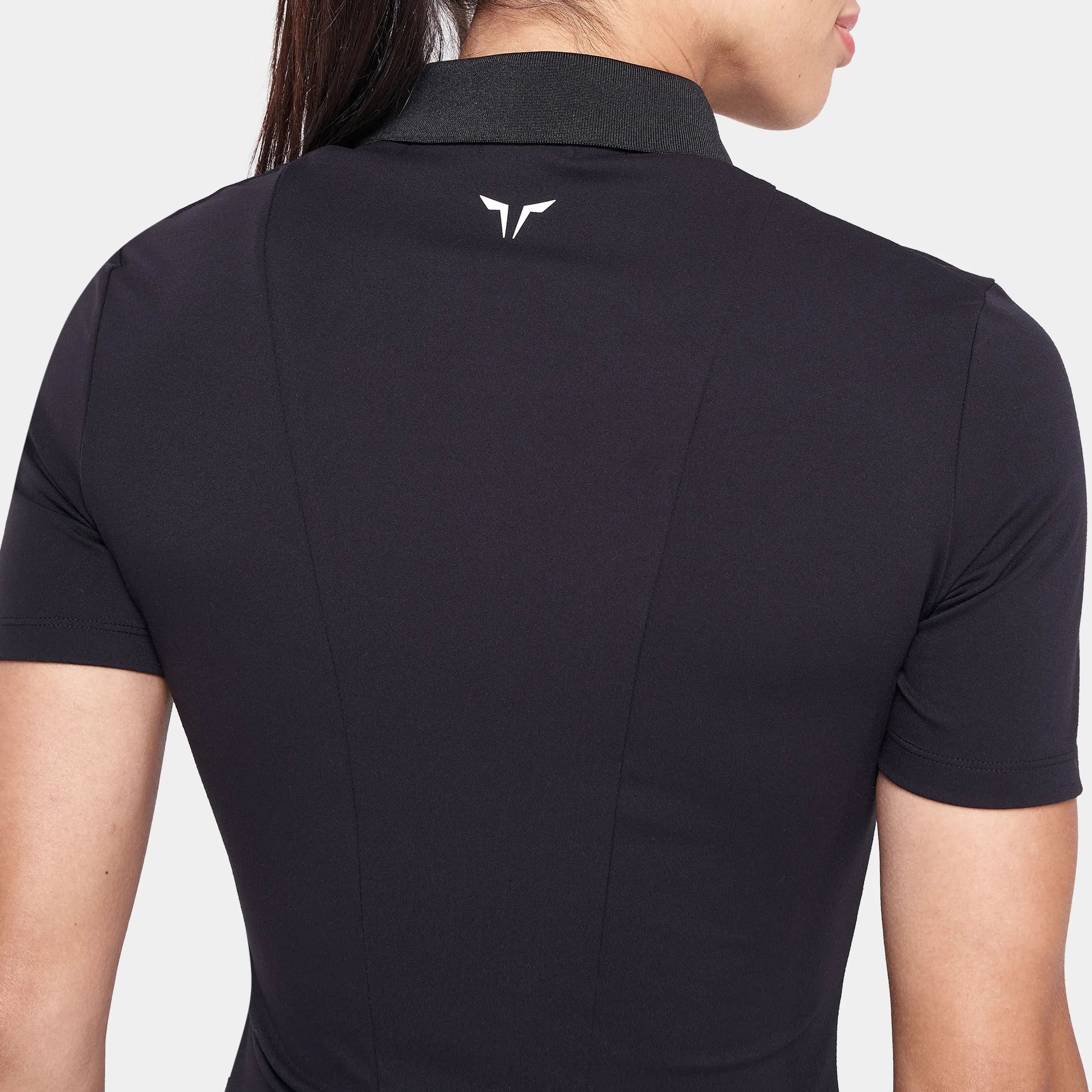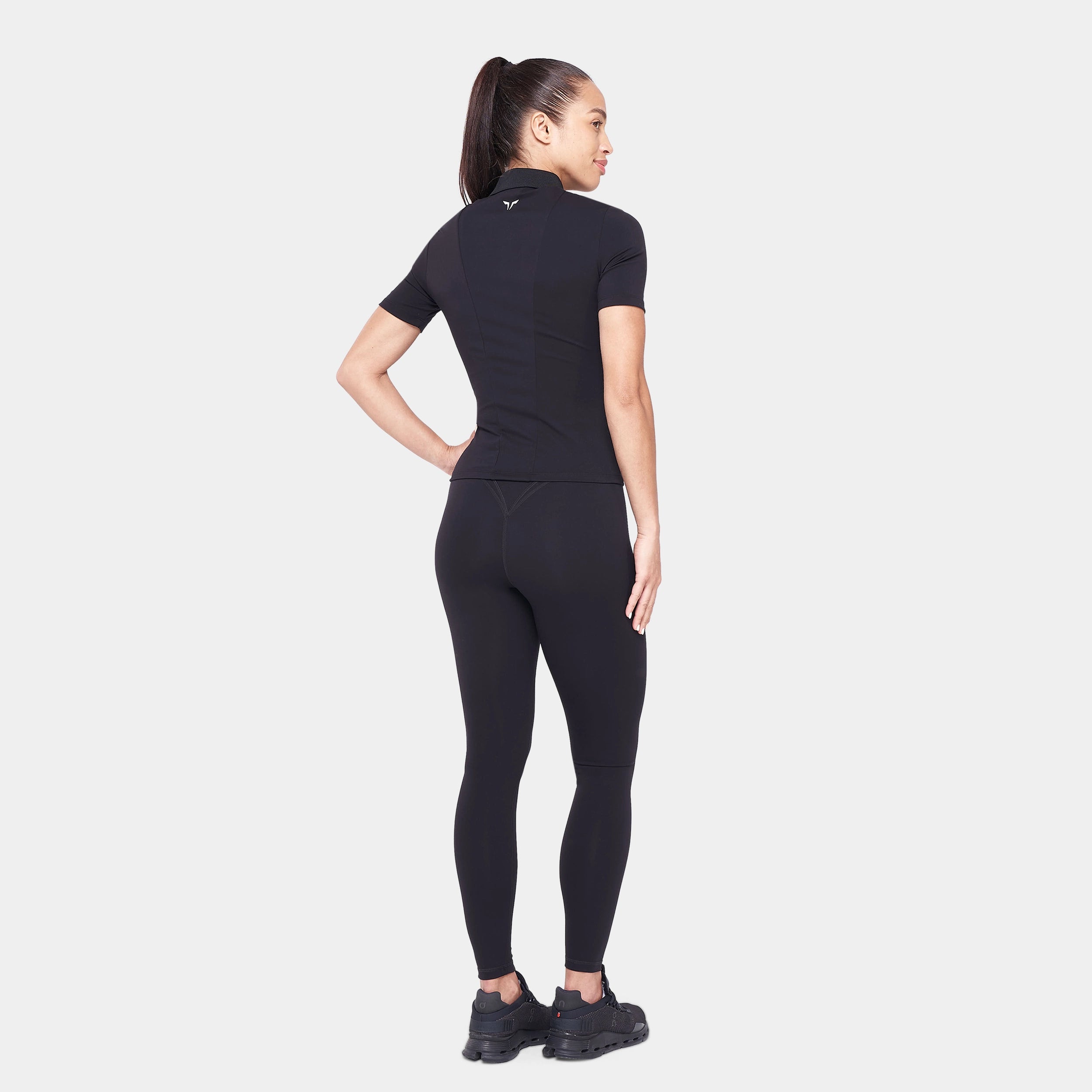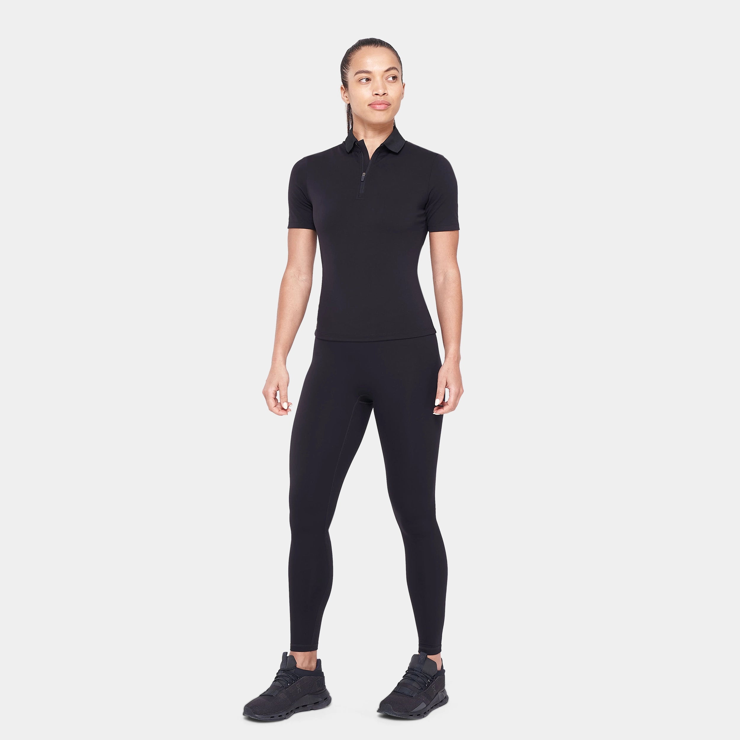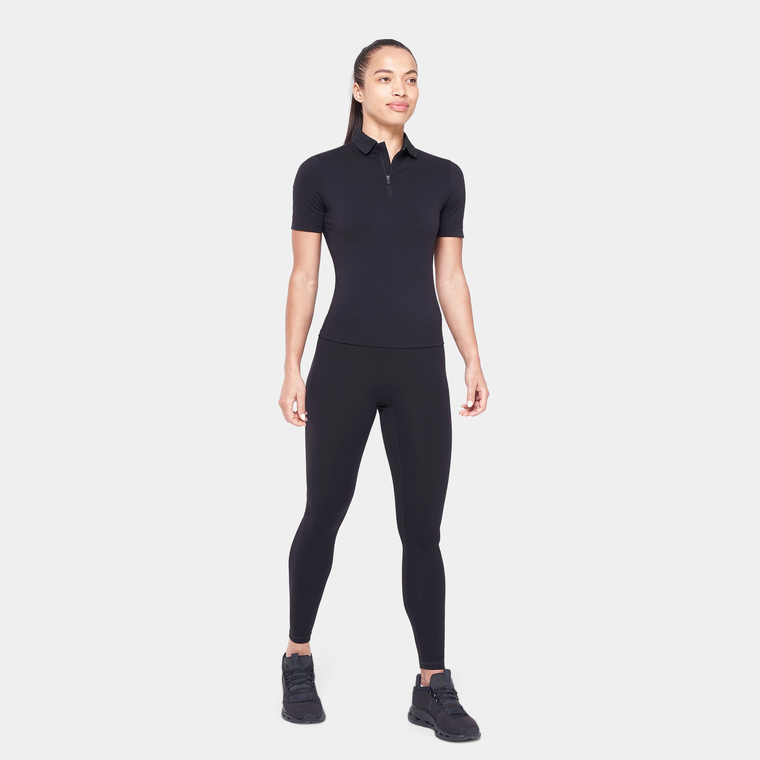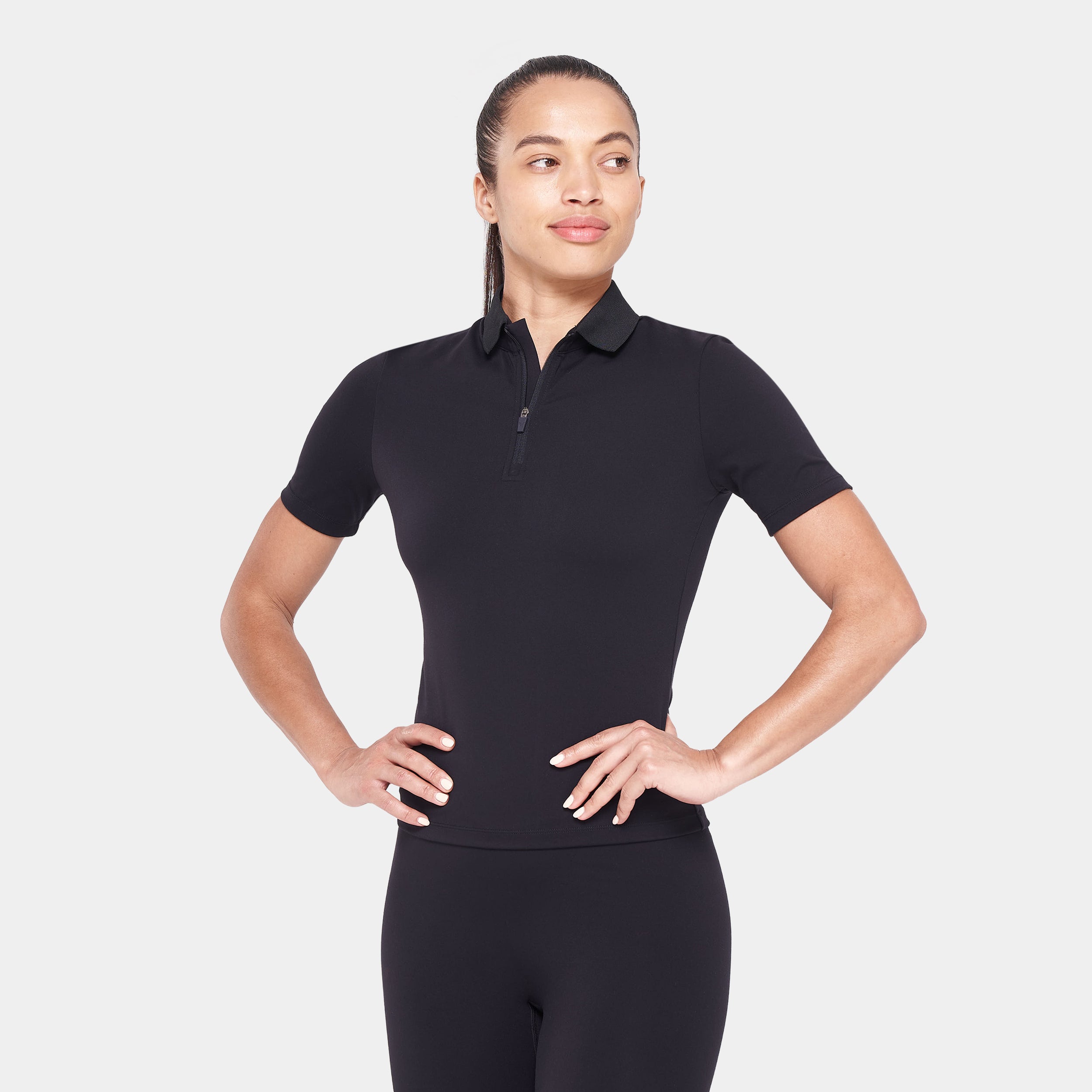 Ultra comfortable Soft brushed hand feel 4-way stretch High hip Ribbed collar with quarter zip closure Set in short sleeve Backward shoulder seams Back panel detailing Athletic fit Model Wearing Small: Height 5'8" / 173 cm // Bust: 35" // Waist: 27.5" // Hips: 40"